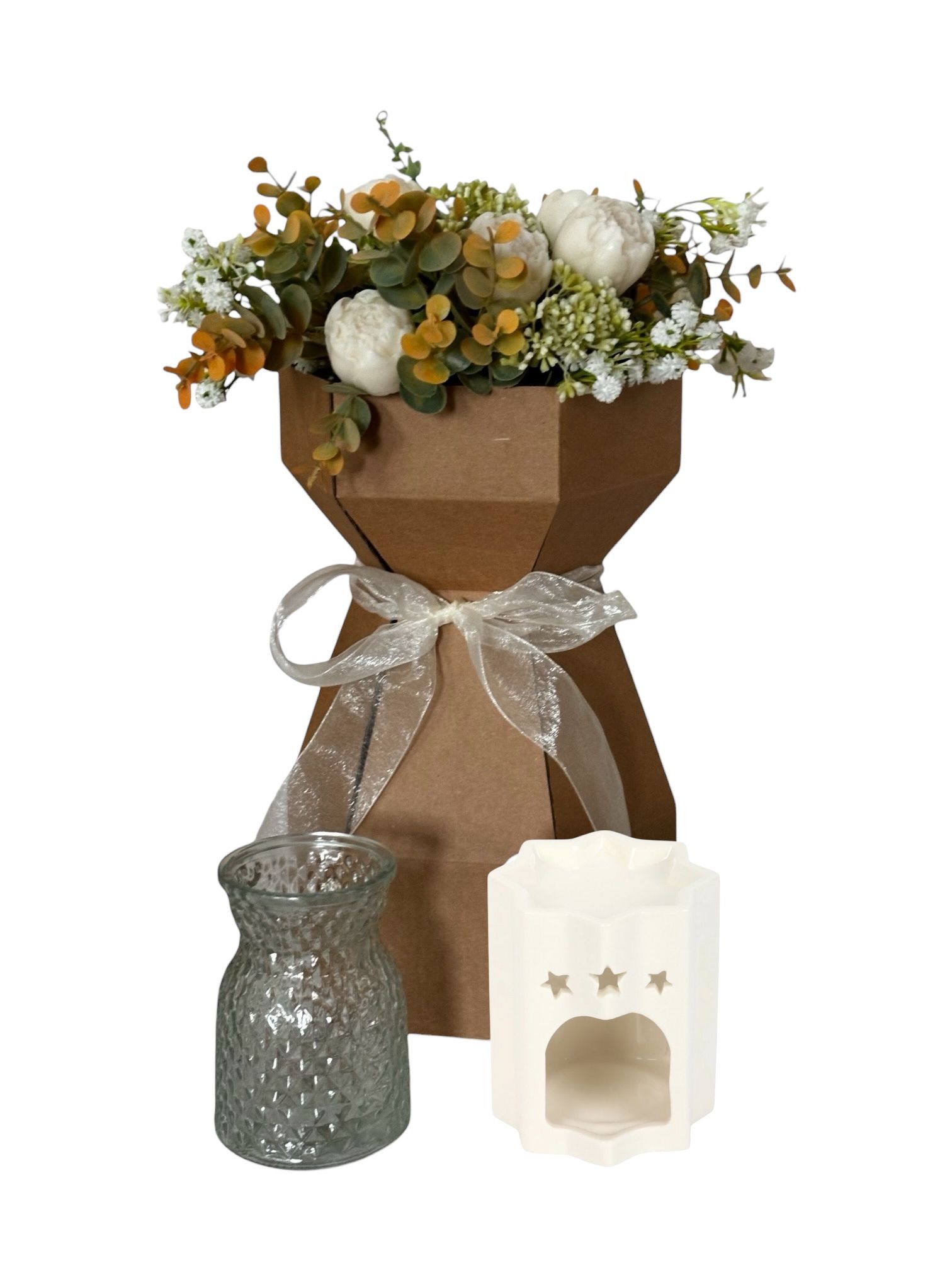 Included in your gift set, nestled in the bottom of your bouquet is one of our beautiful lotus burners & a diamond effect Vase. the perfect starter kit or introduction to wax melts.